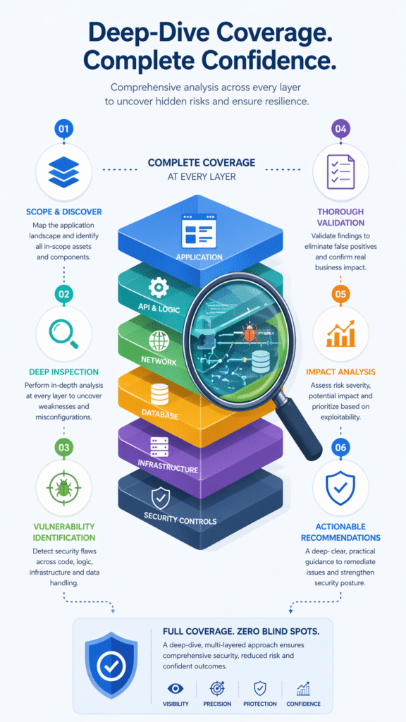 A mature network assessment validates what an adversary can really reach from the internet, not just what asset inventories claim exists. The work emphasizes exposed appliances, weak protocols, and management planes that collapse perimeter assumptions